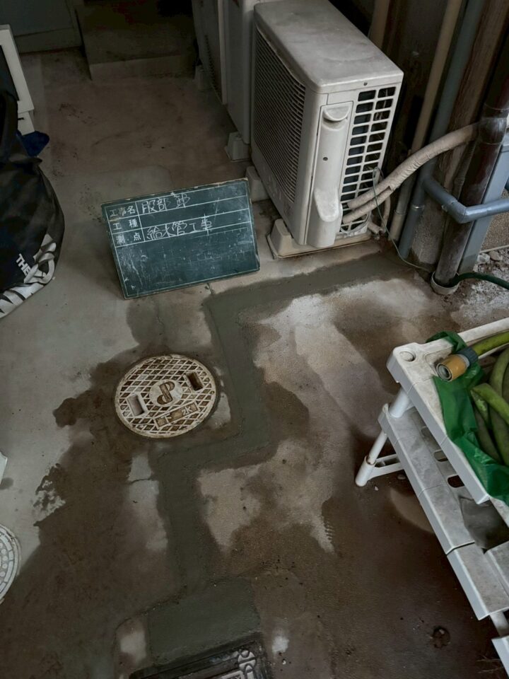 - 屋外の床面(駐車スペース付近)に、工事前に漏水の痕跡が確認された(写真より)