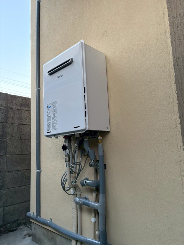 新しいRinnai(リンナイ)製給湯器が壁面に設置された状態。配管も整理されている。