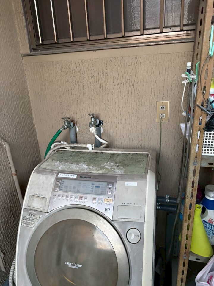 - 洗濯機置き場(半屋外)の給水栓まわりに既存の古い配管が接続されていた