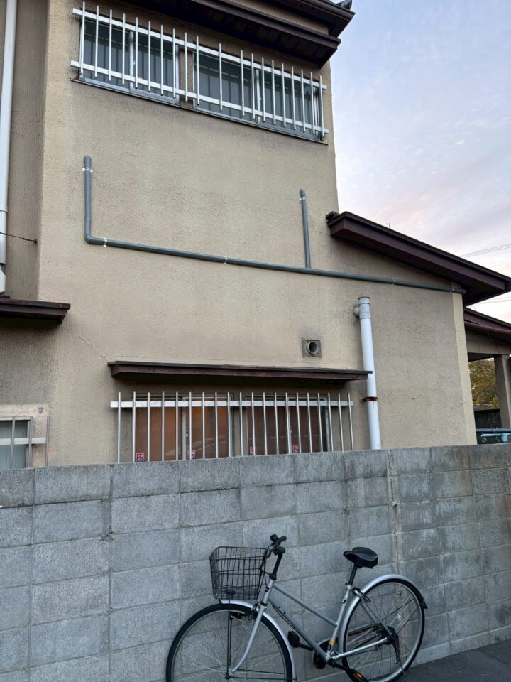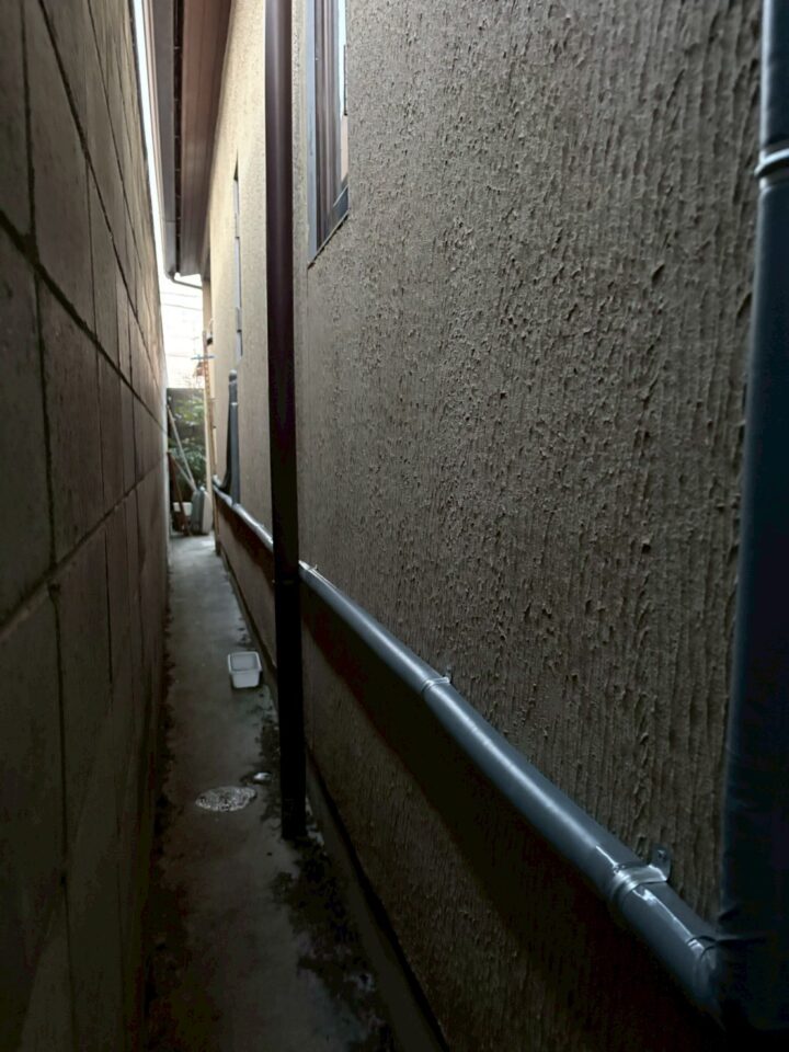 建物側面の通路。新しい配管がクリップで固定され、整然と壁面に沿って設置されている。