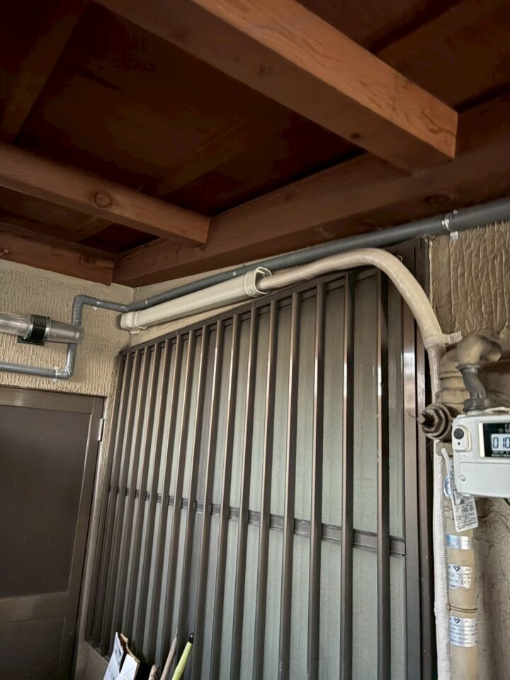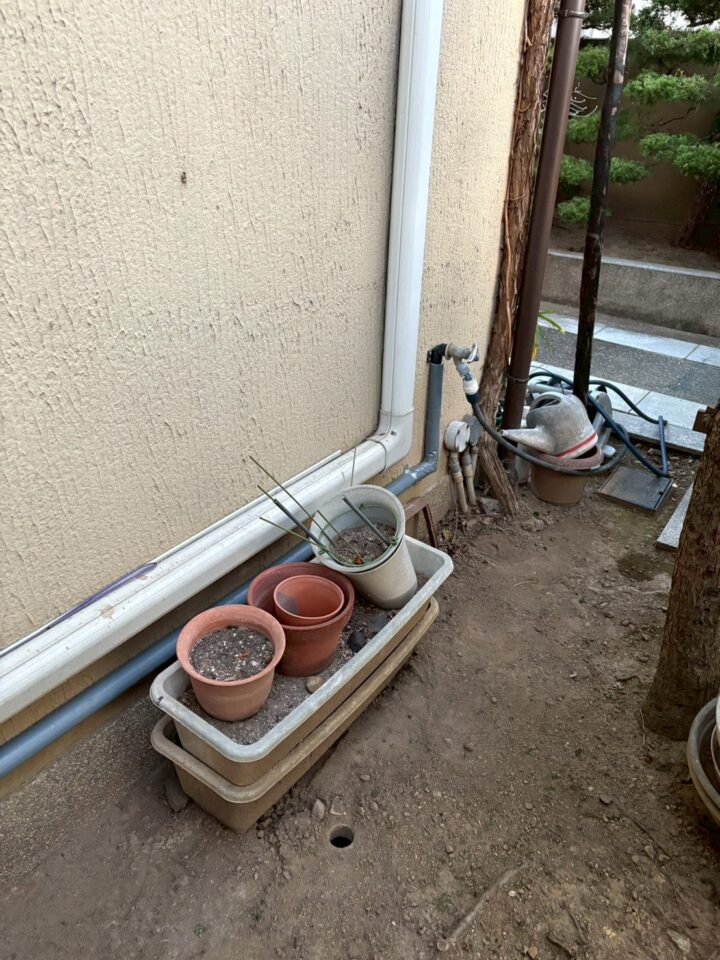 建物の側面・裏手・正面庭側と、複数の面にわたって配管が老朽化しており、部分的な修理ではなく全面的な引き直しが必要な状態でした。