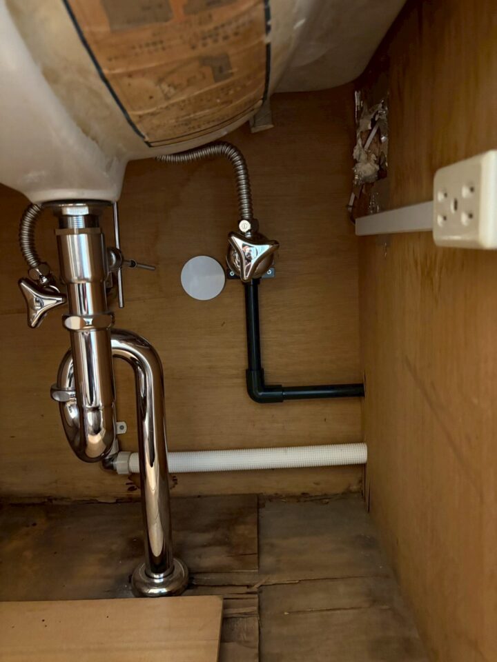 キッチン流し台下。新設の止水栓・給水管が整然と施工されている。