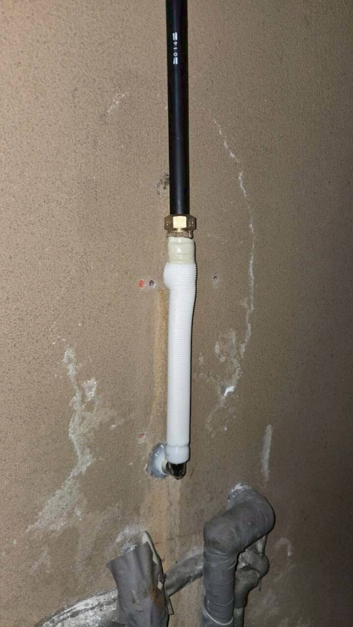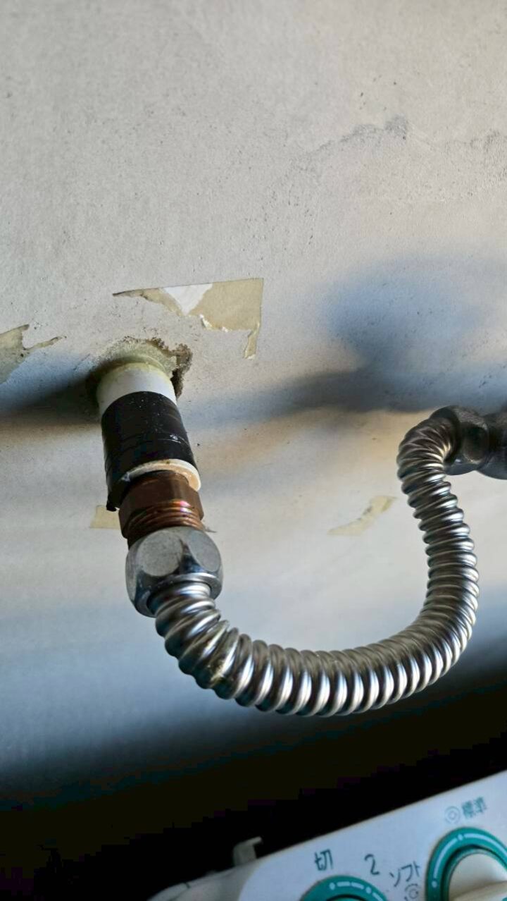 作業写真③:屋内配管の接続部。フレキ管と壁面の接続部に劣化と補修跡が確認できる(施工前)