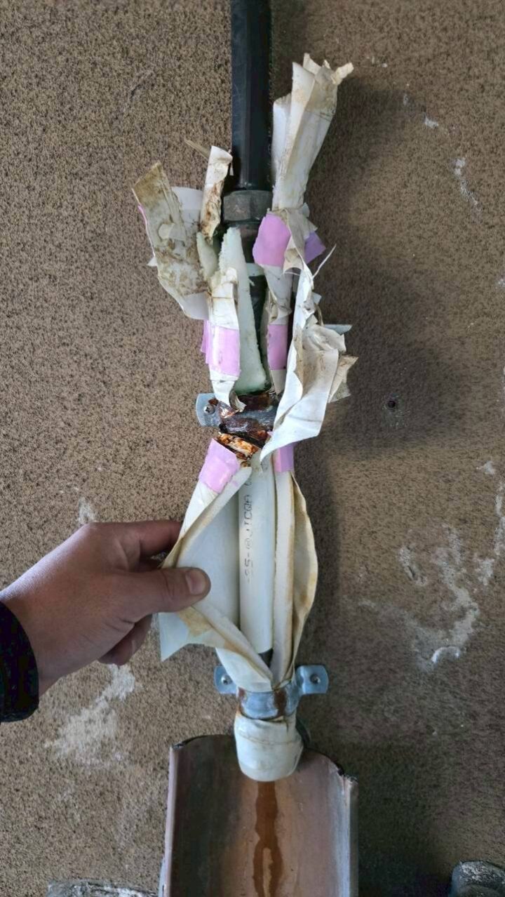 作業写真④:配管継手部分。シール材・補修テープが重ねて巻かれており、錆・腐食も見られる(施工前)