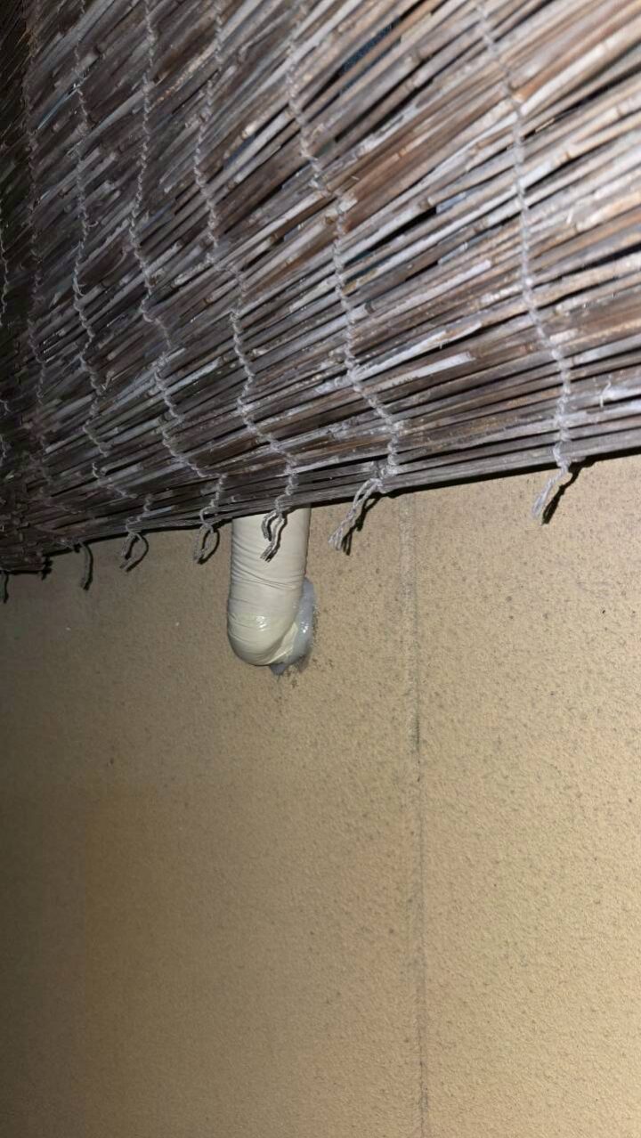 作業写真⑥:軒下の配管端部。テープで応急処置がなされていた(施工前)
