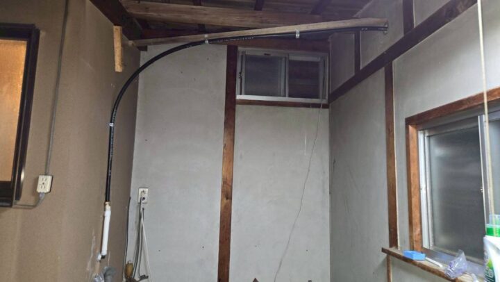 作業写真⑨:室内配管の新設工事中。天井・壁面にポリ管を配管している