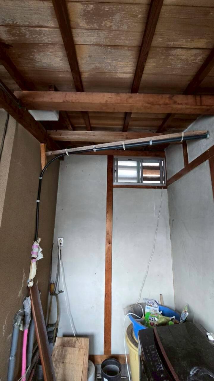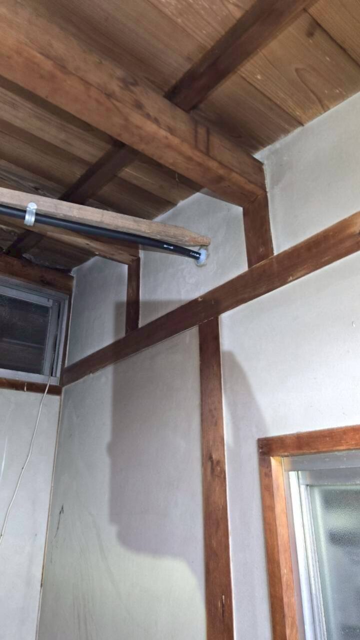 作業写真⑪:木造の天井・壁面に沿った配管ルートの様子