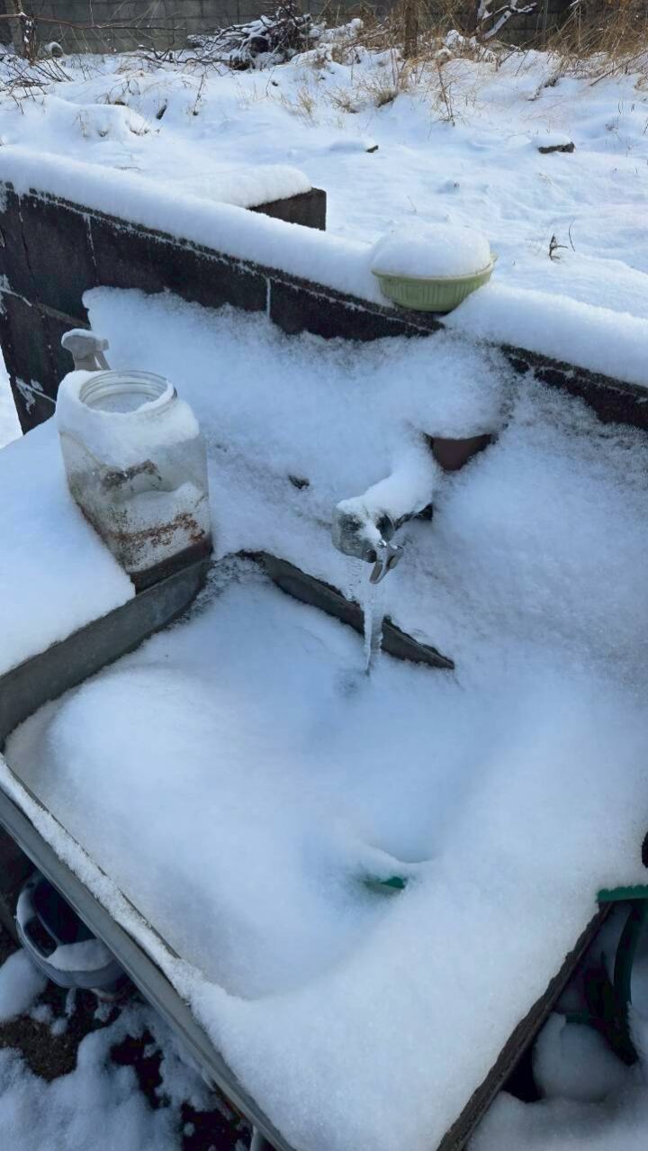 作業写真⑫:冬季施工。屋外シンクと蛇口まわりが積雪・凍結した状態での作業