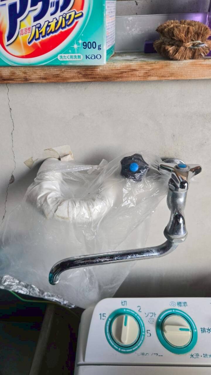 洗濯機まわりの蛇口も取り外して新しい部品に交換しています。