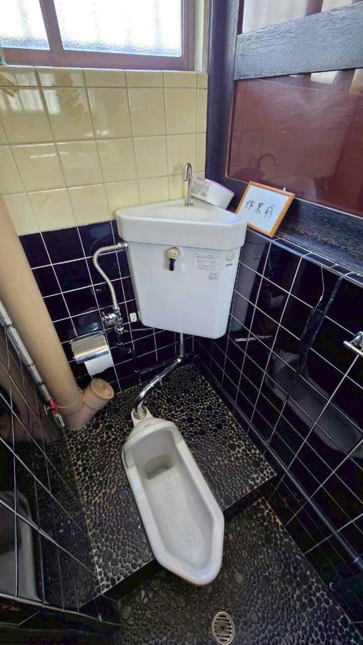 施工前は、高置きロータンク式の和式トイレが設置されていました。黒タイルの壁・玉石敷きの床といった昔ながらの造りで、トイレ空間全体にも年季が感じられる状態でした。
