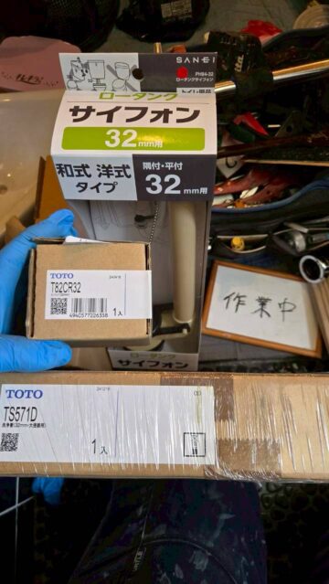 今回の施工ではTOTO製の機器・部品を使用しました。洋式便器本体・ウォシュレット(温水洗浄便座)のほか、洗浄管・ロータンク内部品・サイフォン(排水制御部品)もTOTO製を選定しています。現場の寸法・排水位置に合わせて適切な部材を組み合わせています。
