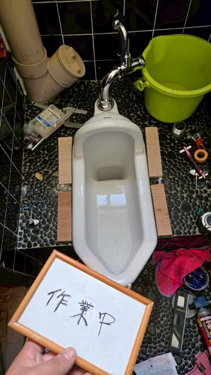 施工中:新しいTOTO製洗浄管・配管アームを取り付けているところ