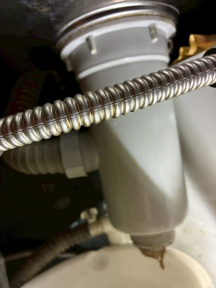 今回の施工では、小便器フラッシュバルブの交換と合わせて、キッチン排水部品の交換も実施しました。排水ホースや接続部品を新しいものに交換し、排水まわりの状態を整えています。
