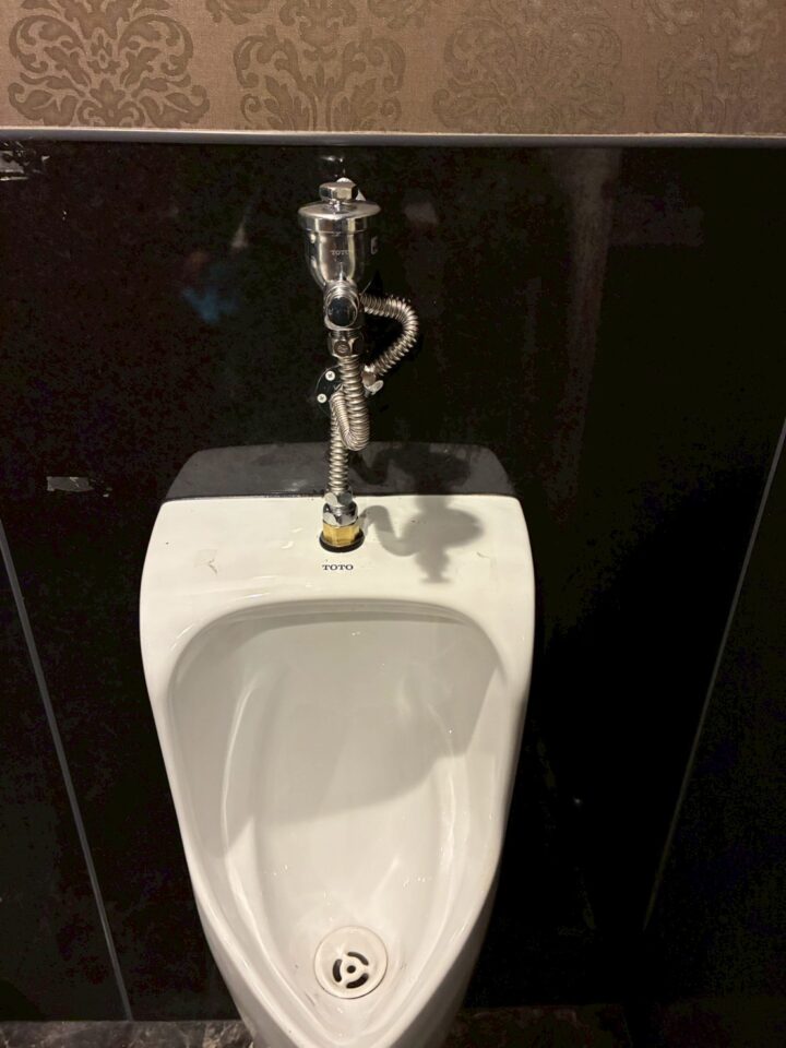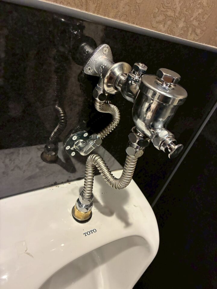 小便器のフラッシュバルブおよび給水管の接続まわりに、経年劣化による腐食が確認されました。タンク接続部のナットには著しい青錆が生じており、接続部品の劣化が進んでいる状態でした。
